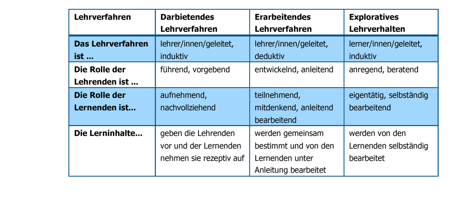 Beim zweiten Aspekt zur Verschmelzung von analogem und digitalem Lehrformat handelt es sich weniger um die Form der verwendeten Medien und Technologien, sondern um den Charakter der Ausrichtung der Lehre. Dabei lassen sich Lehrverfahren als darbietend, erarbeitend und explorativ beschreiben und unterscheiden. Fast zwangsläufig verschiebt sich der Fokus des Lehrverfahrens bei der integrativen Berücksichtigung von analogen und digitalen Lehrelementen in Richtung exploratives Lehrverhalten. Wird eines der verschiedenen Lehrformate genutzt, ändert sich analog zum Lehrverfahren auch die Rolle der Lehrenden und Lernenden (siehe Abb. 2).