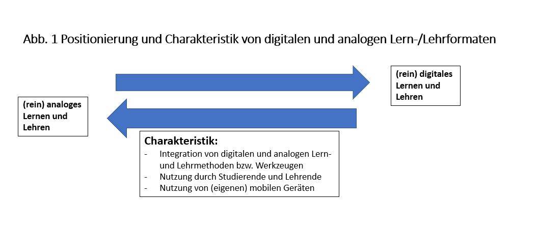 (a) Die Lehrenden und Studierenden nutzen ihre Geräte und ggf. das Internet in der Präsenz-Lehrveranstaltung; (b) die Lehrenden setzen auf Konzepte der Lehrveranstaltungen, bei denen analoge und digitale Lernelemente und Methoden zu einem verschmelzen oder (c) die Lehrenden und Studierenden nutzen ihre Geräte und ggf. das Internet außerhalb von Präsenzlehrveranstaltungen, etwa für die Kommunikation, die Dokumentation, die Planung oder sonstige Lern- bzw. Lehraktivitäten.