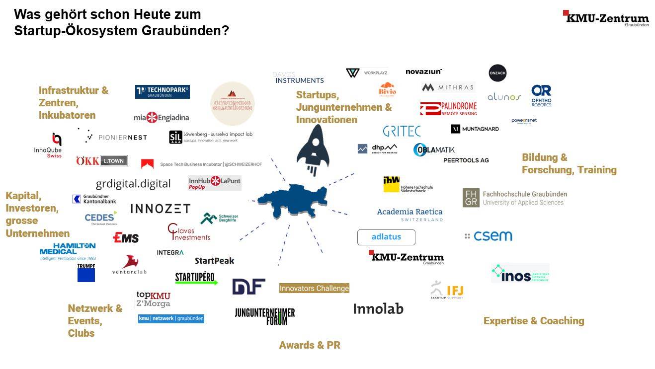 Die aktuellen gesellschaftlichen und wirtschaftlichen Entwicklungen sowie die Politik von Bund und Kanton haben auch in Graubünden die Entstehung eines beachtlichen Innovations- und Start-up-Ökosystems ermöglicht (siehe Abbildung 2: Ökosystem Graubünden). Bei seinem Engagement für das Start-up-Ökosystem Graubünden fokussiert das KMUZ auf Jungunternehmen, Start-ups und Spin-offs von KMU, die weiterführende Informationen und Unterstützung suchen, sowie auf die Vernetzung dieser Unternehmen mit den Akteuren des Ökosystems Graubünden. Dieses ist sehr vielfältig und bietet hervorragende Kompetenzen.