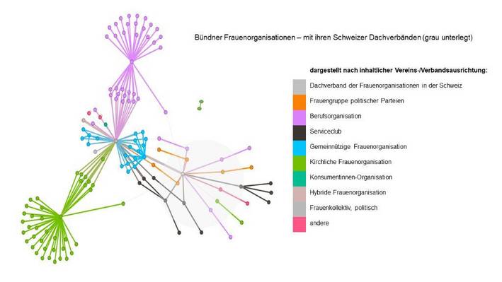 Frauennetzwerke bieten ihren Mitgliedern die Chance, individuelle Verhaltensstrategien einzusetzen. Gleichzeitig gewähren sie auch sozialen Rückhalt. Dieser zeigt sich in Form von gegenseitiger Wertschätzung und Anerkennung, Zugang zu Informationen sowie (ehrenamtlicher) Mitarbeit und zeitlicher Präsenz. In formal organisierten Frauennetzwerken begründen verbindliche soziale Normen das «Wir» in Form von solidarischen Verhaltensweisen nach innen und aussen. Stabile Strukturen mit klaren Rollenerwartungen (z. B. Frauenvereine und -verbände) geben Sicherheit. Im Rahmen des Projekts PROMO Femina wurde in Graubünden eine Vorstudie (Desktop Research) zu regionalen Frauennetzwerken durchgeführt. In unserem Kanton finden sich zahlreiche Frauenorganisationen, die entweder formal oder über gemeinsame Aktivitäten lose vernetzt sind (siehe Abb. 1).