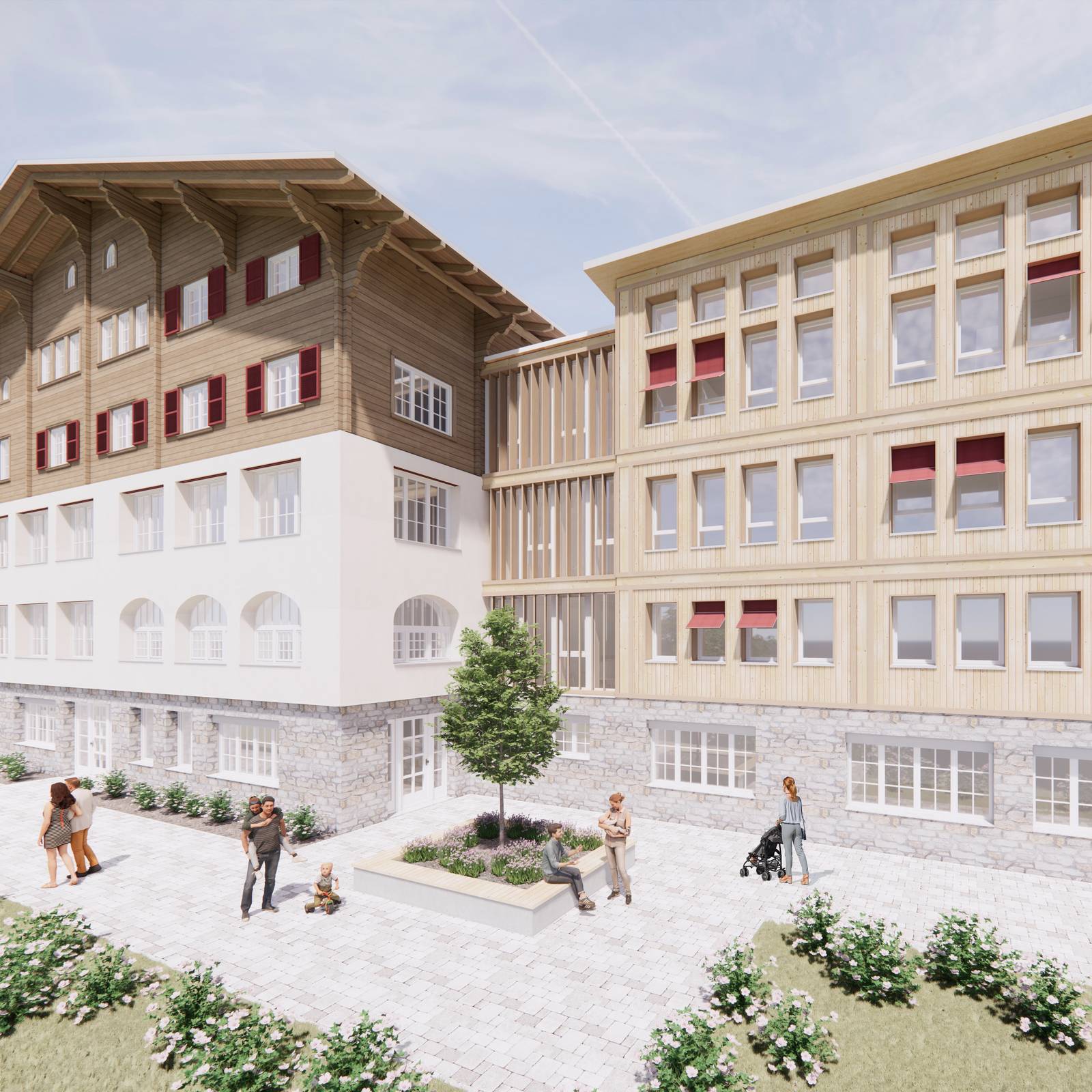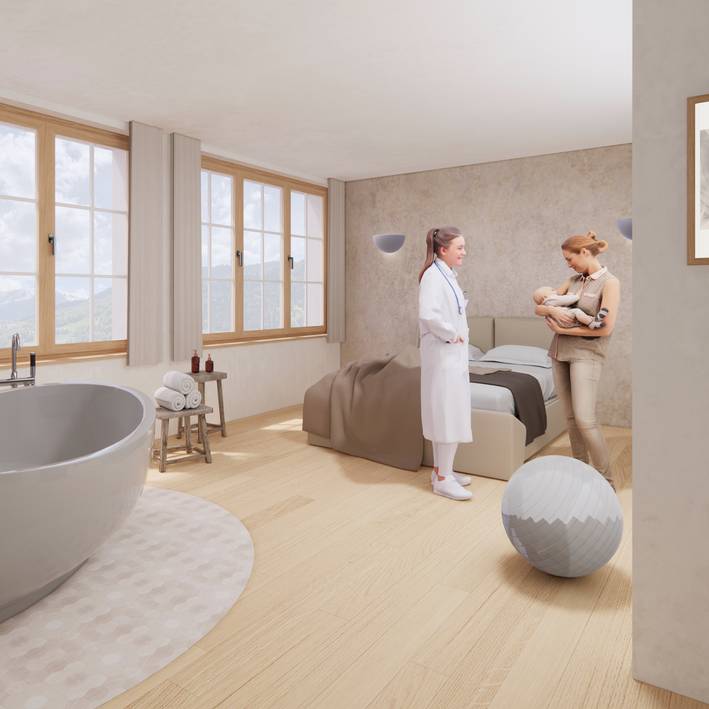 Bei derselben Thesis-Aufgabe schlug der Student Andres Gassner für das bestehende Gebäude gar eine psychologische Rehaklinik für stationäre Aufenthalte vor. Der Erhalt von bestehender Bausubstanz schafft viel Potenzial, spart Ressourcen und bietet ungewohnte Chancen für neue Nutzungen. Der Student plante eine Klinik, die erhöhten gestalterischen Anforderungen genügen muss.