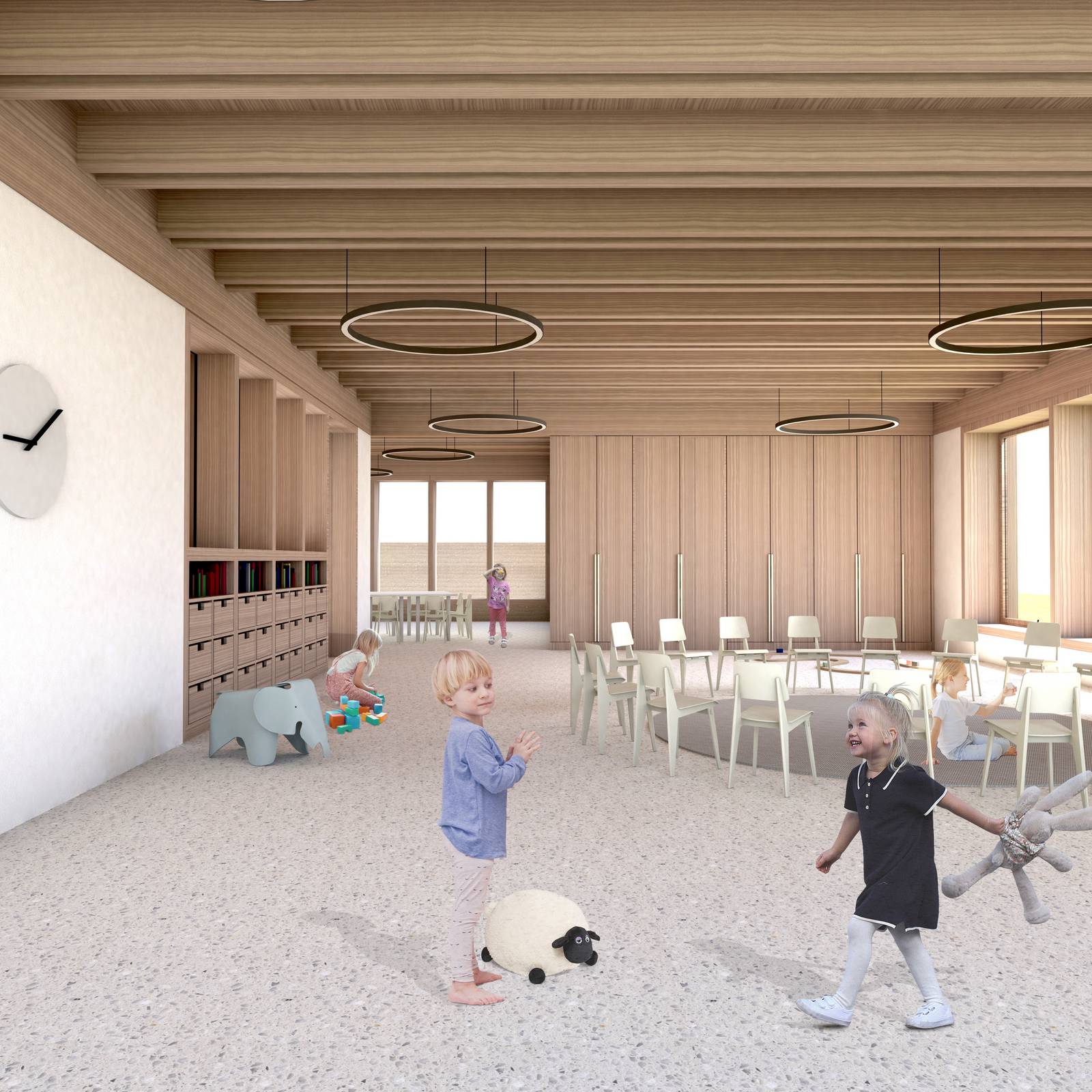 Der Student Kevin Bosshard schlug für den Kindergarten ein stimmiges Ensemble von drei Bauten aus Stampflehmwänden vor. Stampflehm ist nicht nur ein ökologisch vorteilhafter Baustoff – er regelt auch die Feuchtigkeit und die Temperatur der Innenräume sehr gut und ist dazu noch antiseptisch. Gerade heute kommen vermehrt wieder «gesunde» Baustoffe auf der Baustelle zum Einsatz.