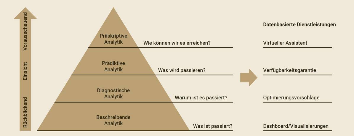 Die Datenanalyse-Pyramide zeigt vier Analytikschritte auf, die datenbasierte Dienstleistungen ermöglichen: beschreibende, diagnostische, prädiktive und präskriptive Analytik. Beschreibende Analytik fokussiert sich auf rückblickende Elemente und die Frage «Was ist passiert?». Datenbasierte Dienstleistungen dieser Stufe beinhalten oft Dashboards oder Visualisierungen schon geschehener Ereignisse. Diagnostische Analytik beschäftigt sich mit der Frage «Warum ist es passiert?» und bietet erste Einsichten – bei Dienstleistungen oft in Form von Optimierungsvorschlägen. Prädiktive Analytik kombiniert Einsicht und Voraussicht und beantwortet die Frage «Was wird passieren?». Im Rahmen datenbasierter Dienstleistungen ermöglicht diese Analytikstufe durch (Zustands-)Prognosen einen reibungslosen Betrieb und bietet dadurch eine Verfügbarkeitsgarantie gegenüber dem Kunden oder der Kundin. An der Spitze der Datenanalyse-Pyramide befindet sich die präskriptive Analytik, die sich mit dem Thema «Was soll ich unternehmen?» beschäftigt. Mit der Integration der Vielzahl an verfügbaren Daten werden anhand von virtuellen Assistenten Handlungsempfehlungen abgegeben.