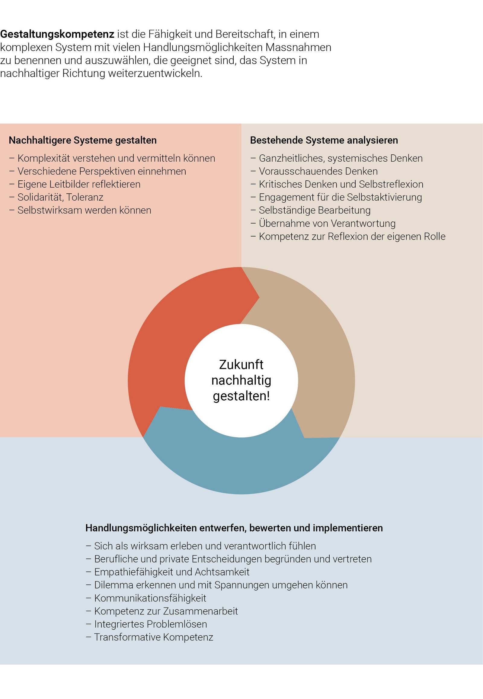 Zudem sollen, wo sinnvoll und möglich, die Gestaltungskompetenzen in bestehende Module integriert werden und Initiativen von Studierenden, die eine Kompetenzorientierung unterstützen, gefördert werden.
