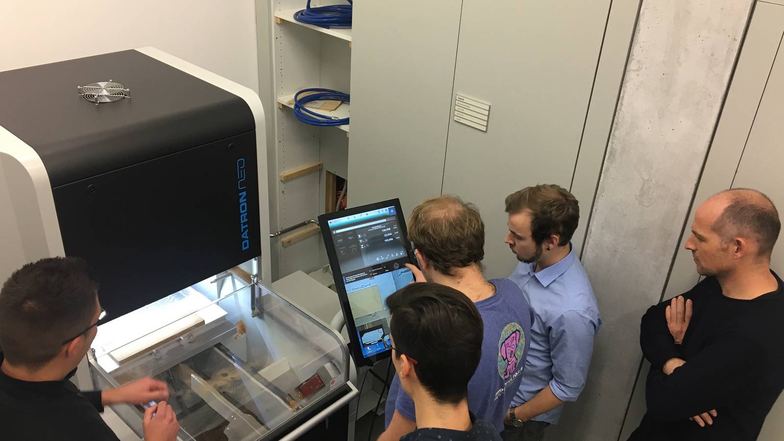 Um verschiedene Materialien wie Kunststoffe, Aluminium und Holz zu bearbeiten, wurde eine Datron-Neo-4-Achsen-Fräsmaschine angeschafft. Dank der einfachen Handhabung und der Einbindung von 3D-CAD-Systemen können die Studierenden schon nach wenigen Schulungsstunden selbstständig und sicher Prototypen herstellen. Die Anlage wird einerseits für die Projektarbeiten in den oberen Semestern, andererseits auch für Forschungsprojekte genutzt.