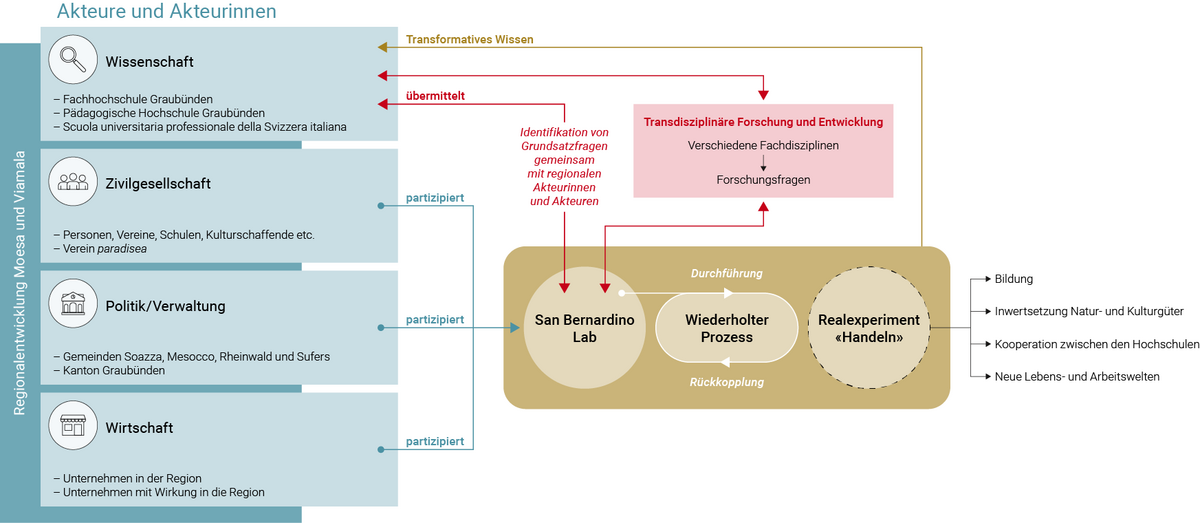 Als Reallabor bietet das «San Bernardino Lab» den Rahmen, die Herausforderungen und Themen der Region unter Einbezug aller Akteure und Akteurinnen anzugehen, um gemeinsame, zukunftsfähige Lösungen zu finden. Dazu werden Realexperimente (transdisziplinäre Forschungsprojekte) durchgeführt und wissenschaftliche und ausserwissenschaftliche Perspektiven vereint. Dies bedingt eine vertrauensvolle, enge Kooperation auf Augenhöhe zwischen allen Akteuren.