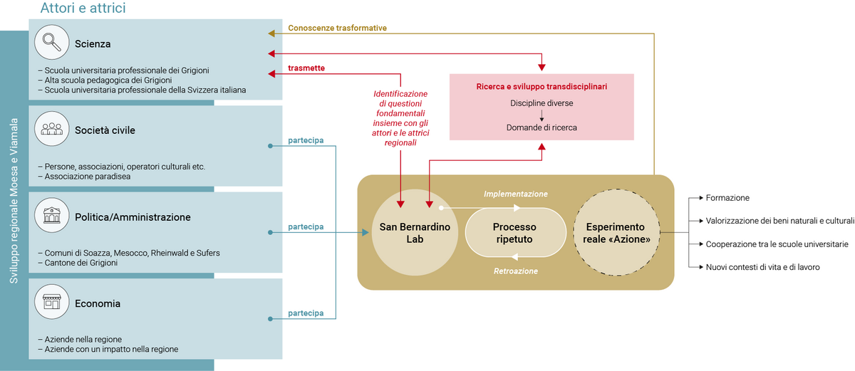 Il «San Bernardino Lab» fornisce un quadro di riferimento per affrontare le sfide e le questioni delle regioni, coinvolgendo tutte le parti interessate per trovare soluzioni comuni sostenibili. A tal fine vengono effettuati esperimenti reali (progetti di ricerca transdisciplinari) e si affiancano prospettive scientifiche e non scientifiche. Ciò richiede una stretta cooperazione basata sulla fiducia su un piano di parità tra tutte le parti interessate.