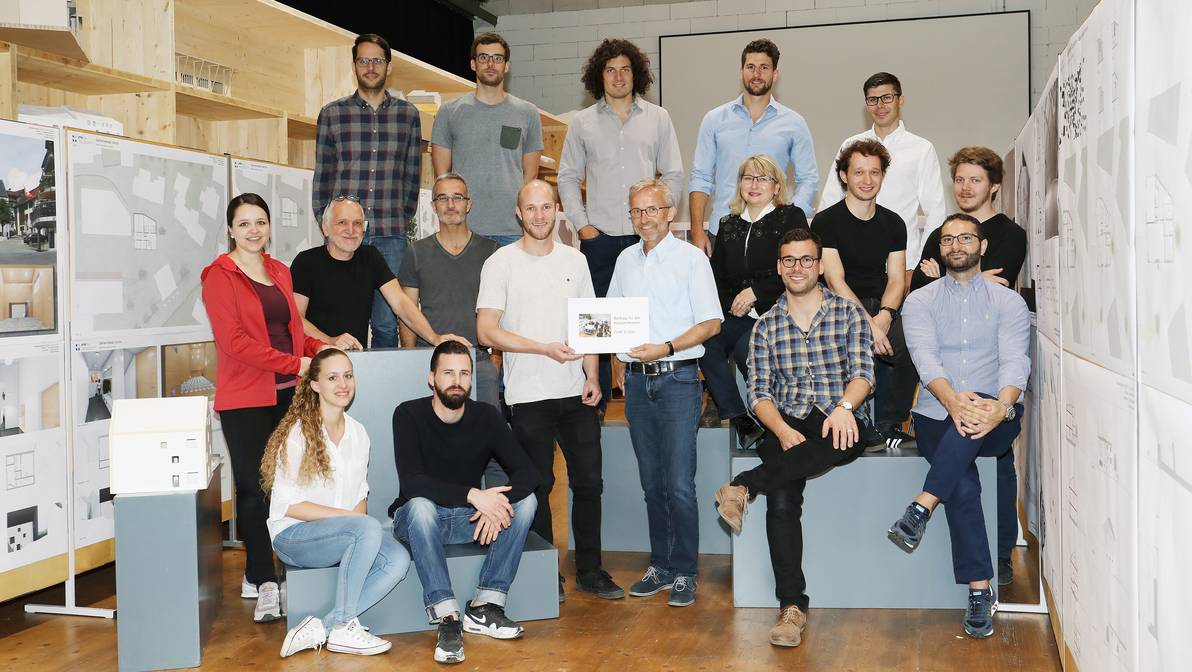 - Fredi Bürke (AG für städtisches Wohnen) übergibt den Architektur-Studierenden der HTW Chur einen Check über CHF 5,000 für die Klassenkasse. Dies im Beisein von Prof. Dr. Sylvia Manchen, Leiterin Departement Lebensraum und Mitglied der Hochschulleitung (mittlere Reihe dritte von rechts), sowie den Dozenten Prof. Christian Wagner und Robert Albertin (mittlere Reihe zweiter und dritter von links). Der Gewinner, Michael Wagner, ist der zweite von rechts in der mittleren Reihe. (30. Juni 2017)