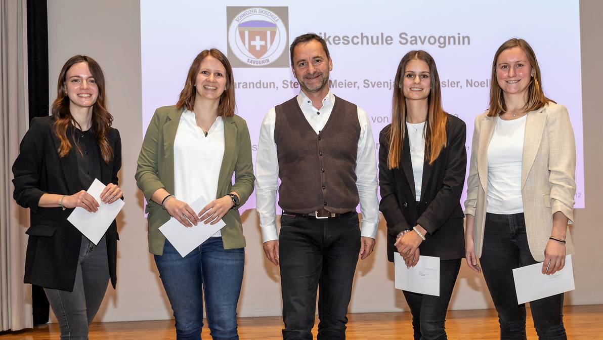 Wärmere Winter mit weniger Schnee beschäftigen gerade auch in Graubünden verschiedene Regionen. Mit dieser Problematik haben sich die vier Studentinnen Sina Barandun (Felsberg, GR), Stefanie Meier (Seewis Dorf, GR), Svenja Neuhäusler (Pfäfers, SG), Noelle Wolf (Scharans, GR) auseinandergesetzt und für die Skischule Savogin eine neue Geschäftsidee ausgedacht. Ihr Businessplan, mit dem sie den zweiten Platz im Wettbewerb erreicht haben, sieht die Erweiterung des Betriebs der Skischule durch eine Bikeschule vor. Die vier Studentinnen wurden für ihren Businessplan mit 1000 Franken belohnt, gestiftet von der Graubündner Kantonalbank. Den Preis für den zweiten Rang überreichte ihnen Enrico Lardelli, Geschäftsleitungsmitglied der Bank und Hochschulrat der FH Graubünden.