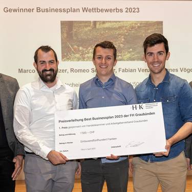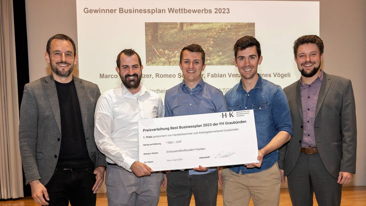 - news-fhgr-best_businessplan_2023_gewinner.jpgDas Gewinnerteam: Elia Lardi (Handelskammer Graubünden), Fabian Venzin, Romeo Scheurer, Hannes Vögeli, Marco Oberholzer (v.l.n.r.)