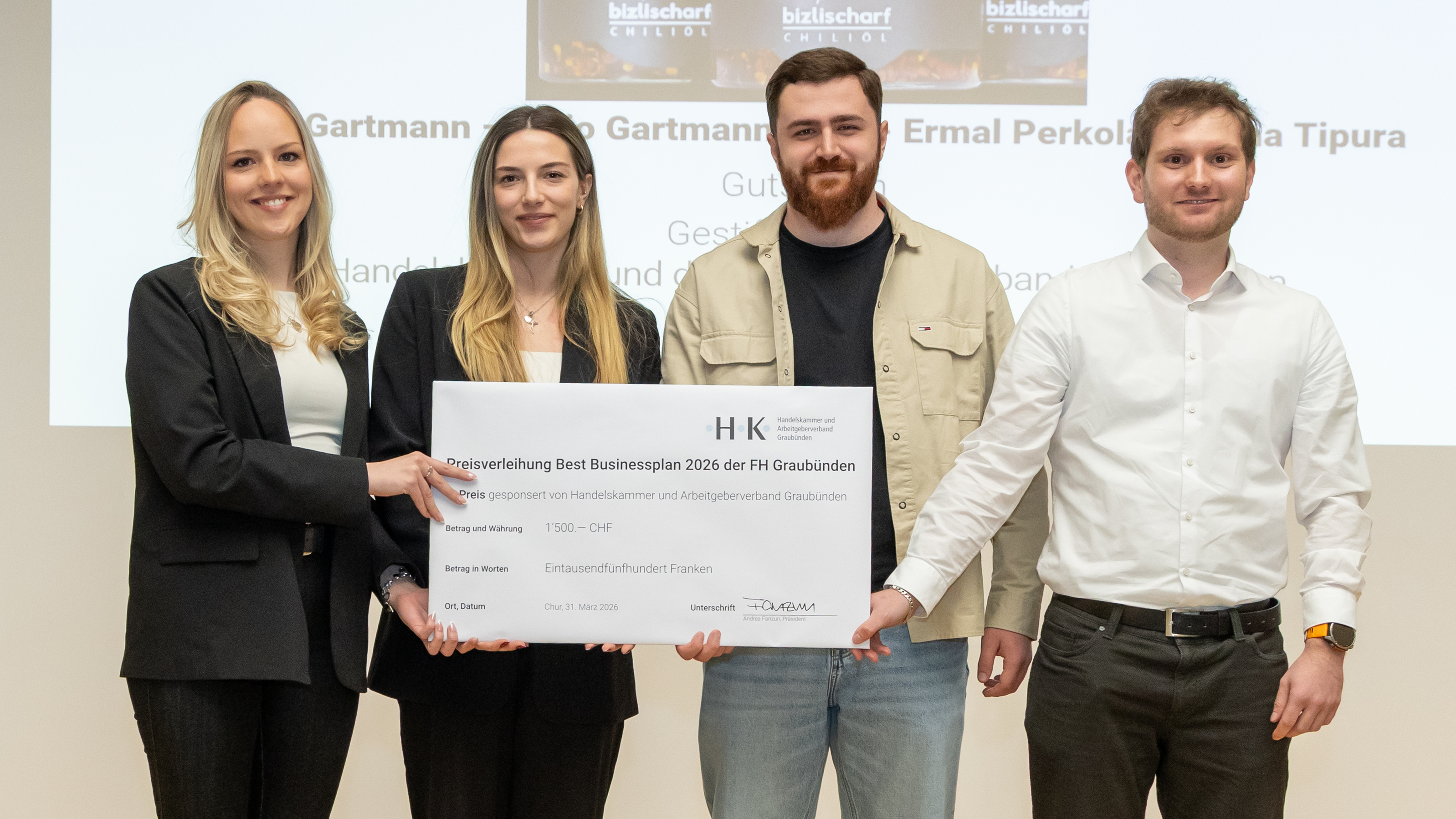 Der erste Preis geht an das Betriebsökonomie-Studierenden-Team, das gemeinsam eine überzeugende Geschäftsidee für das Start-up «bizlischarf» aus Dübendorf (ZH) konsequent weiterentwickelt hat. Besonders überzeugt hat der Businessplan von Jana Gartmann (Chur, GR), Livio Gartmann (Bonaduz, GR), Ermal Perkolaj (Cazis, GR) und Jana Tipura (Mels, SG) durch eine fundierte Validierung der Nachfrage, einen Finanzplan auf sehr hohem Niveau sowie eine Online-Umfrage mit transparenter Methodenkritik, welche die Marktanalyse deutlich hervorhebt. Der von der Handelskammer und dem Arbeitgeberverband des Kantons Graubünden gestiftete Preis in Höhe von 1500 Franken wurde von Präsident Andrea Fanzun überreicht.