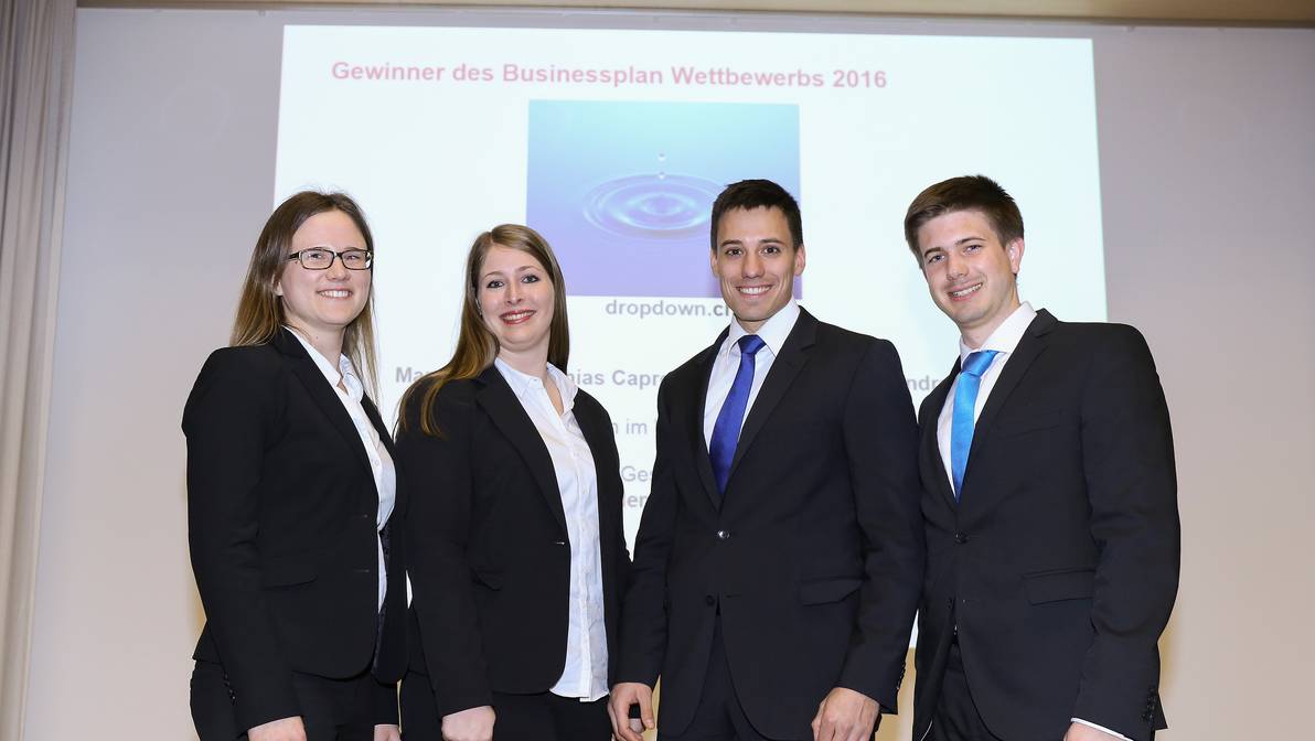 - Gewannen den Best-Business-Plan-Wettbewerb 2016 der HTW Chur für ihren Businessplan für Dropdown.ch: Elena Oberholzer, Sandra Plebani, Mathias Caprez und Marco Beck. (v.l.n.r.)