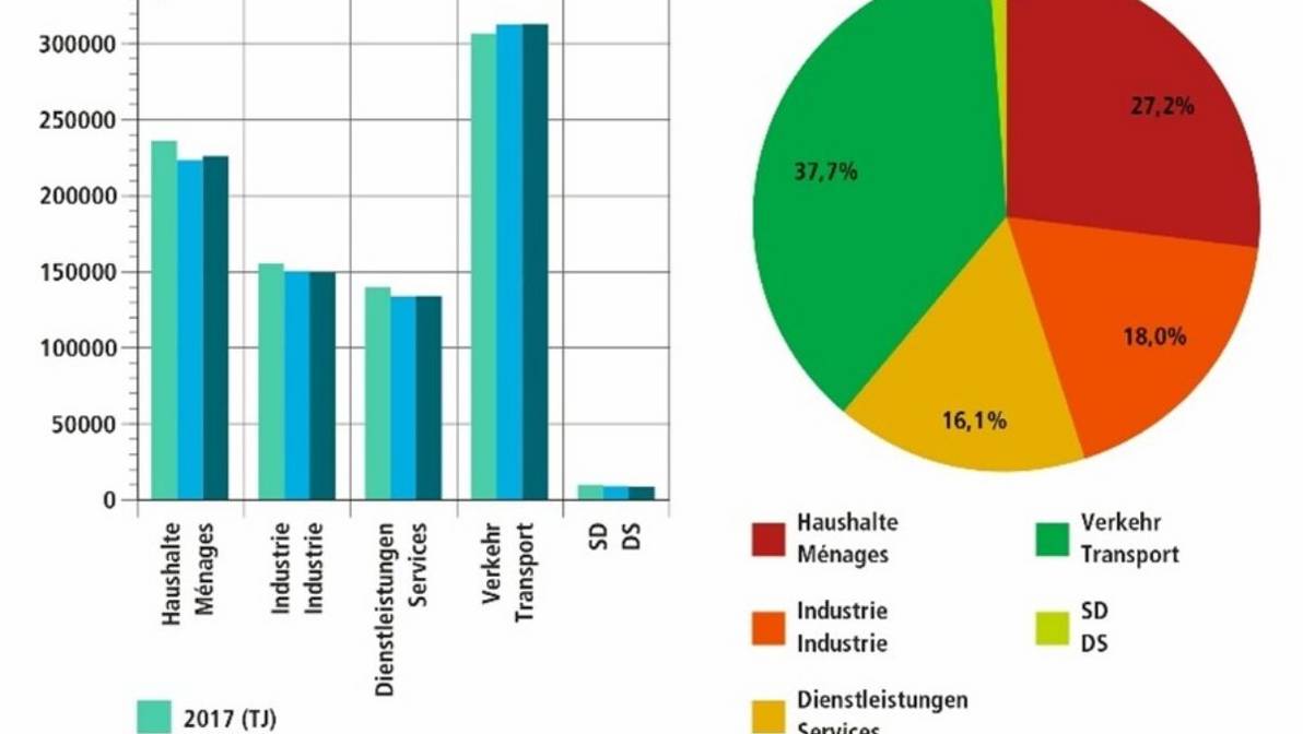 Laut Bundesamt für Energie BFE teilt sich der Energieverbrauch im Jahr 2019 auf in 27% Privathaushalte, 18% Industrie, 16% Dienstleistungen und 37% Verkehr, wie die untenstehende Grafik zeigt.