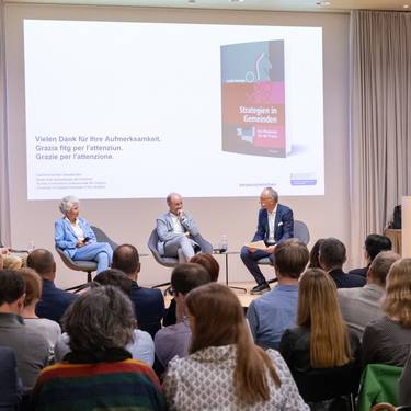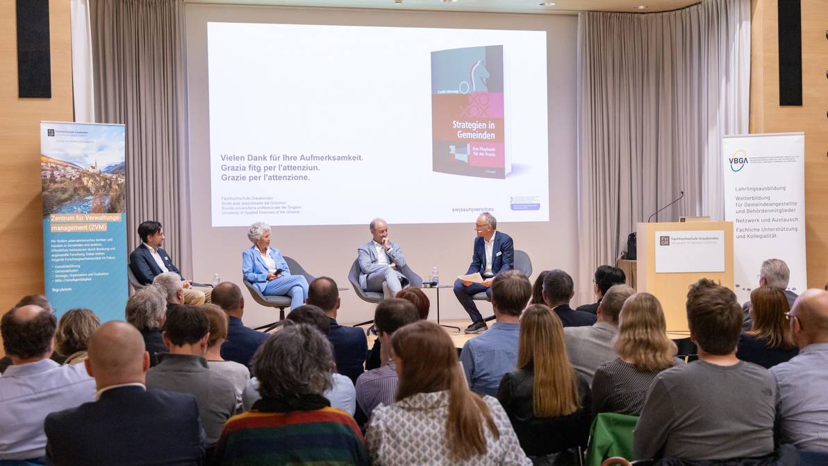 Das 8. GemeindeFORUM der FH Graubünden mit rund 60 Teilnehmenden widmete sich dem Thema «Strategien in Gemeinden neu denken». Nach einem Input-Referat von Curdin Derungs vertieften Rebekka Bernhardsgrütter (Gemeindepräsidentin Embrach/ZH), Urs Marti (ehemaliger Stadtpräsident Chur) und Curdin Derungs unter der Leitung von Ursin Fetz das Thema auf dem Podium.