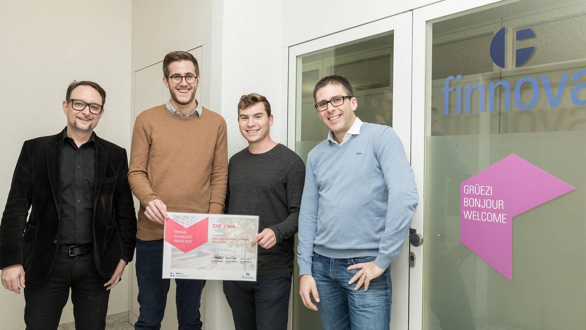 - Die glücklichen Preisträger des Finnova-Technology-Award 2018 mit zwei Jury-Mitgliedern (v.l.n.r.): Ralph Hutter (Head Product Management Digitalisation, Finnova AG), Luca Barletta, Daniel Gnägi, Corsin Capol (Dozent, HTW Chur).