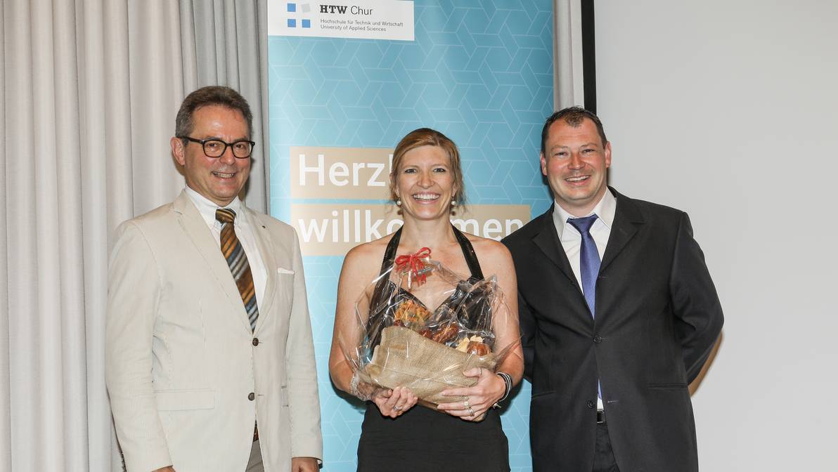 - Die beste Absolventin des Master of Advanced Studies in Information Science 2018: Andrea Traber (Wil, SG) mit dem Rektor, Prof. Jürg Kessler, sowie dem Studienleiter, Prof. Ivo Macek.
