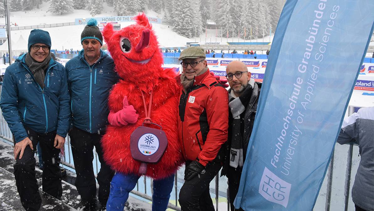 - news-fhgr-winteruniversiade-innen.jpgWuli heisst das Maskottchen der Winteruniversiade 2021 Von links nach rechts: Urs Hunkeler (Geschäftsführer Winteruniversiade), Jürg Kessler (Rektor FH Graubünden), Wuli, Hannes Parpan (OK-Präsident Jugend- und Juniorenweltmeisterschaft Biathlon), Martin Studer (Prorektor FH Graubünden)