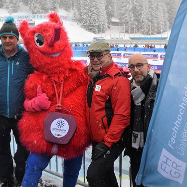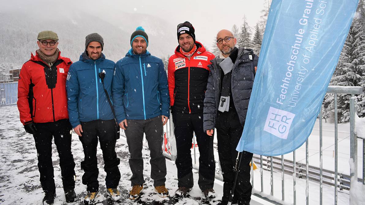 - news-fhgr-winteruniversiade-studierende.jpgAn der Jugend- und Juniorenweltmeisterschaft im Biathlon in Lenzerheide sind auch Studierende der FH Graubünden im Hintergrund im Einsatz. Von links nach rechts: Jürg Kessler (Rektor FH Graubünden), Joel Bieri, Marco Meili (Voluntari), Sebastian Jost und Martin Studer (Prorektor FH Graubünden)