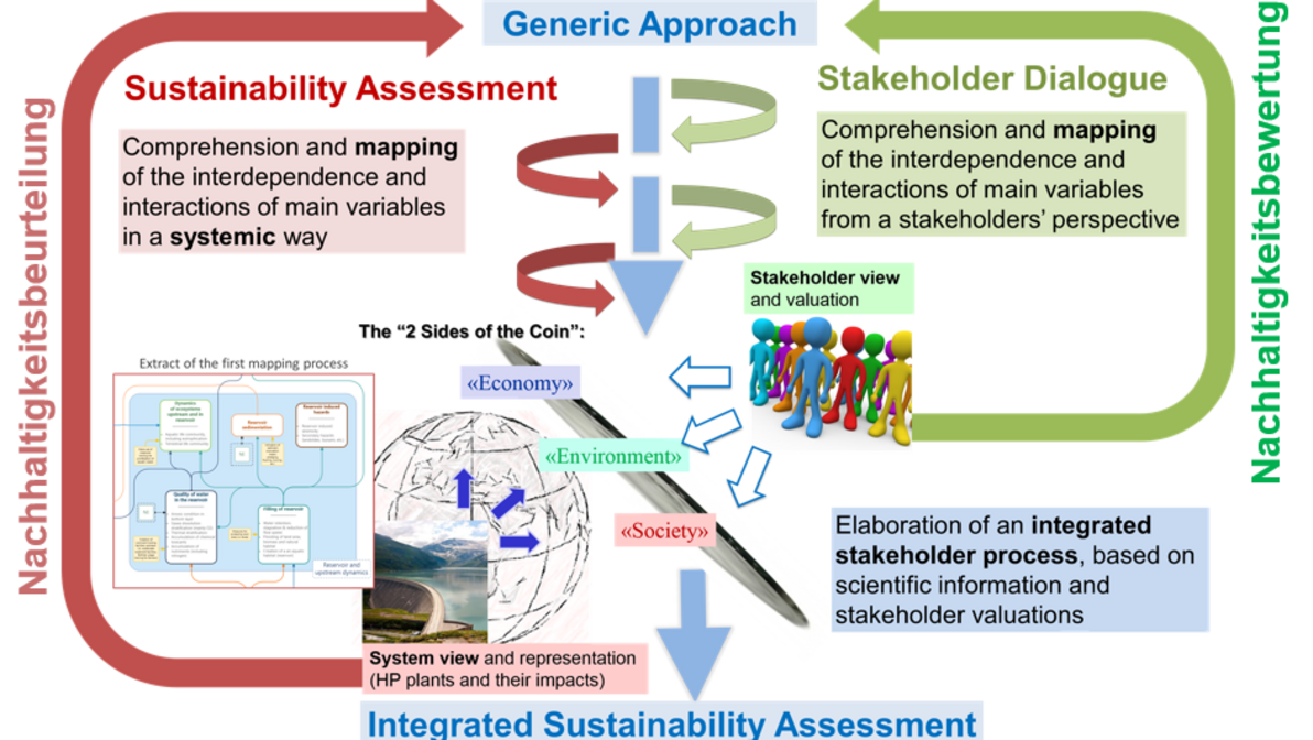 Nachhaltige Entwicklung ist dabei nicht als ein zu erreichender Fixzustand sondern als Prozess zu verstehen. Es handelt sich um ein normatives Konzept, und dieses wird je nach Kontext (Land, Branche, Unternehmung, Person) unterschiedlich verstanden und ausgelegt. Obschon dem Begriff das gemeinsame Prinzip der inter- und intragenerationellen Gerechtigkeit zu Grunde liegt, bestehen viele unterschiedliche Meinungen wie dies in der Praxis zu berücksichtigen ist. Interessenskonflikte sind somit unausweichlich. Aus diesem Grund gilt es, Zielkonflikte frühzeitig und gemeinsam zu bewältigen. Aus wissenschaftlicher Sicht stellt sich hierbei die Frage, wie Politikmassnahmen und Projektvorhaben aus Sicht einer Nachhaltigen Entwicklung beurteilt und bewertet werden können.