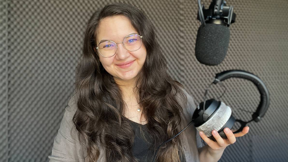 - news-FHGR-Simone-Etter-im-FHGR-Rado-und-Podcast-Studio.jpgSimone Etter, MMP-Studentin und Gewinnerin des SRG-Förderprojekts «Goldstatus», im Podcaststudio der FH Graubünden mit Mikrofon und Kopfhörern.