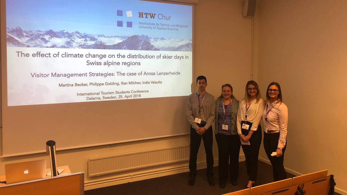 Die Teilnahme der Schweizer Delegation im Schwedischen Falun war von Erfolg gekrönt: Die Tourismusstudierenden der HTW Chur, Martina Becker, Philippa Golding, Ilian Milchev und India Valaulta, gewannen den Best Paper Award. Das diesjährige Thema der vom 25. – 27. April dauernden Konferenz lautete «Limits to Growth». Das von den Schweizer Studierenden eingereichte Paper «The effect of climate change on the distribution of skier days in Swiss alpine regions; Visitor management strategies: The case of Arosa Lenzerheide» überzeugte das akademische Komitee der Konferenz. An der International Tourism Students Conference (ITSC) kommen jährlich Tourismusstudierende der führenden Europäischen Hochschulen zusammen;