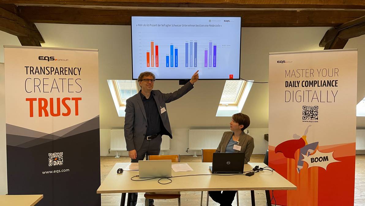 - 211011_Whistleblowing-Report-2021_Bild.jpgChristian Hauser, Professor am Schweizerischen Institut für Entrepreneurship, und Helene Blumer der EQS Group, Mitautorin der Studie, haben am Montag in Zürich die Ergebnisse des Whistleblowing Reports 2021 präsentiert.
