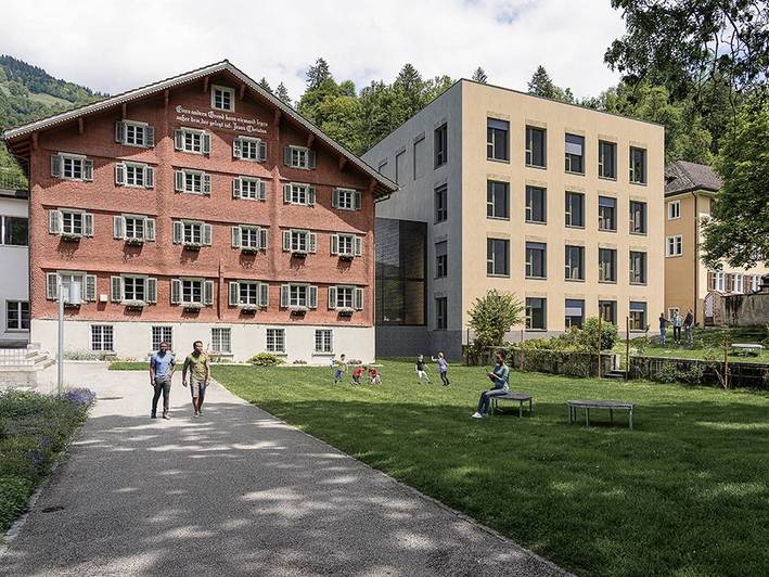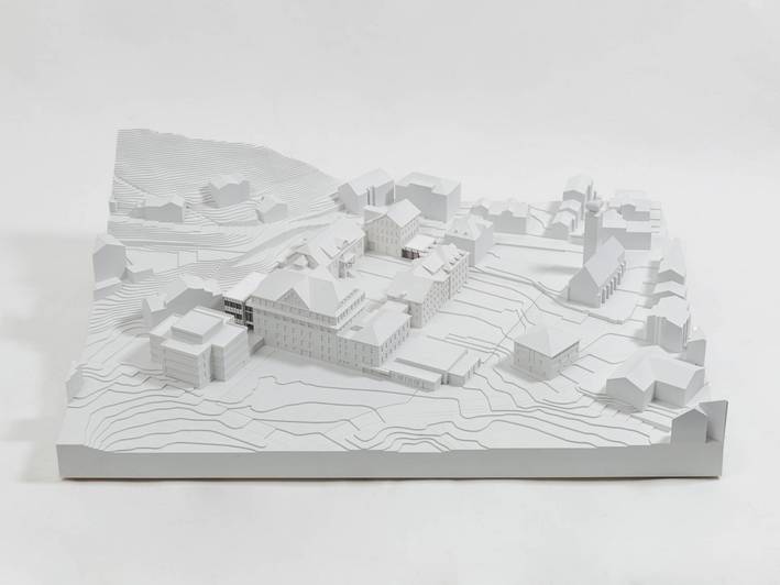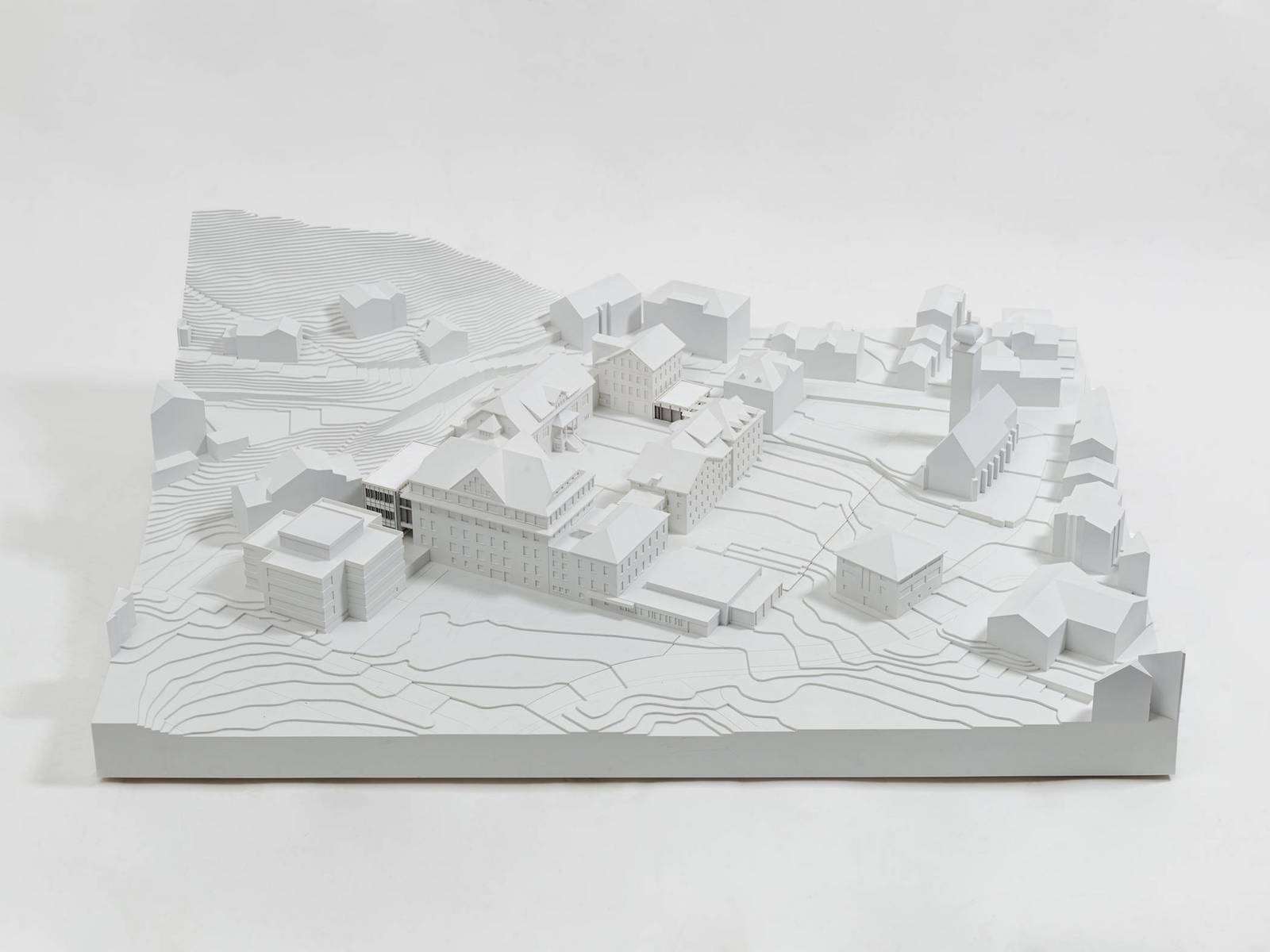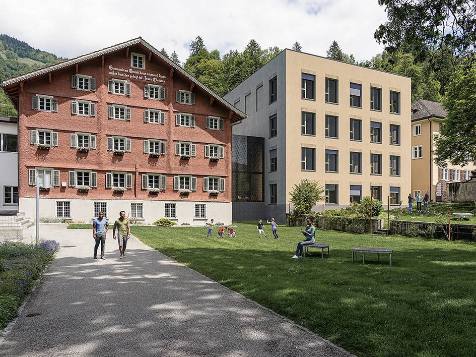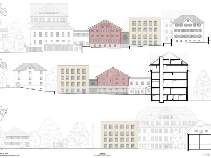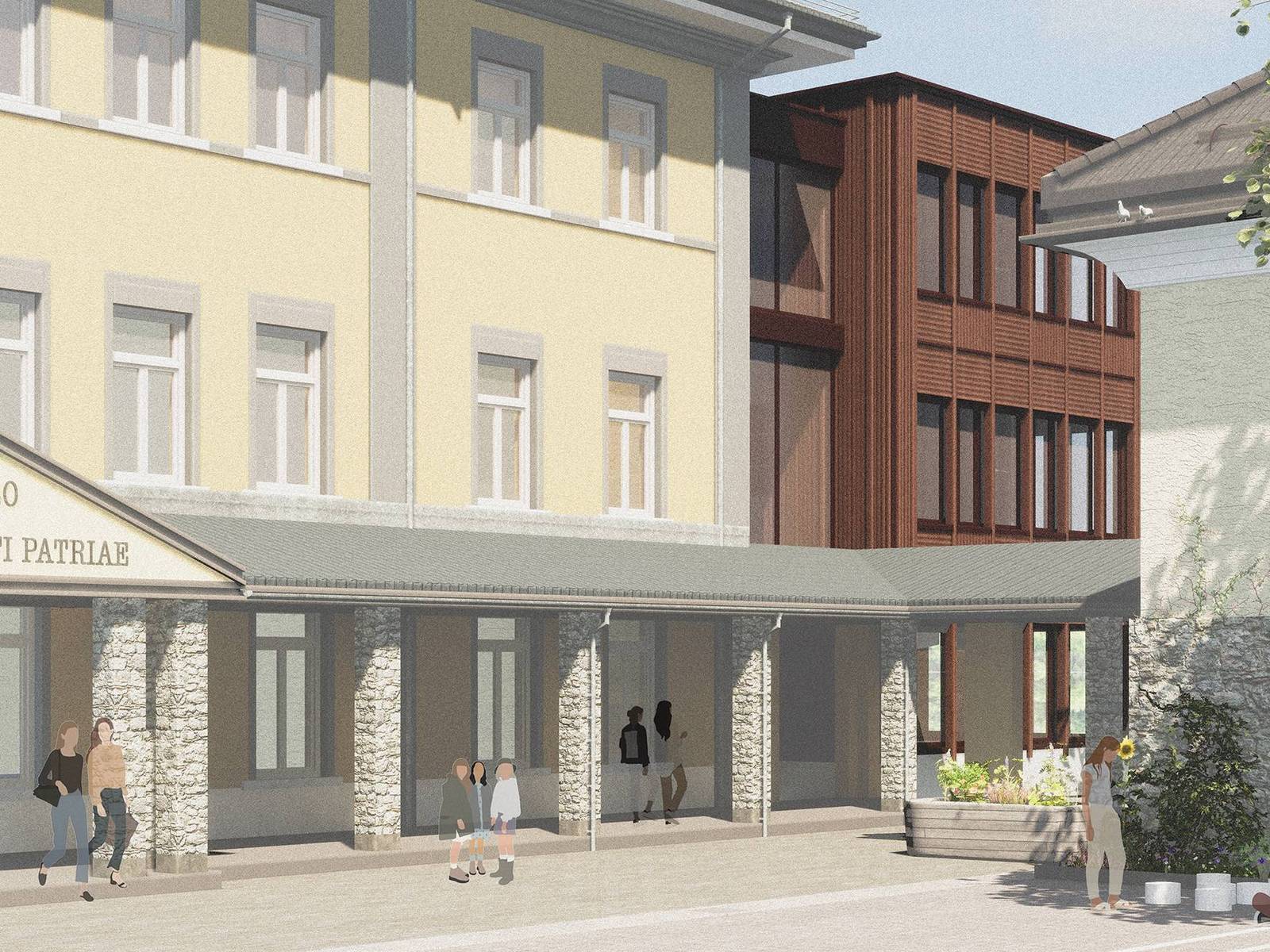 Das historische Schul-Ensemble der EMS Schiers soll funktional erweitert und an heutige Anforderungen angepasst werden. Das Projekt «Verdichtung als Chance» ergänzt das Areal durch zwei Anbauten, wobei Altbau und Steinbau erhalten bleiben. Verwaltungsräume werden im Altbau gebündelt, Geschossdecken entfernt und das Dachgeschoss zu einem grosszügigen Konferenzraum mit Dachterrasse ausgebaut.