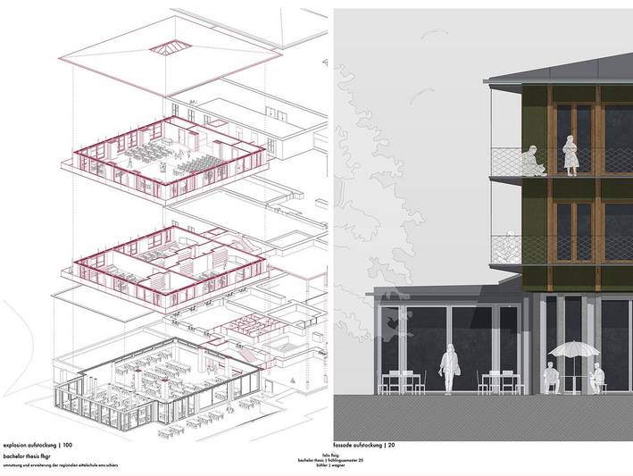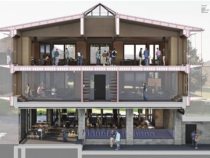 Teil der Aufgabe war es, ein gesamtheitliches Belegungs- und Raumkonzept auf dem Schulareal zu finden. Zudem mussten die Studierenden eine architektonisch qualitative Formulierung zur Funktionalität und zum Raumbedarf, zur Atmosphäre und zur Bauweise entwickeln. Die Bachelor Thesis war somit ein korrespondierender Projektvorschlag für die Umnutzung und Erweiterung der regionalen Mittelschule EMS – die Entwicklung eines hochwertigen Bauprojekts.