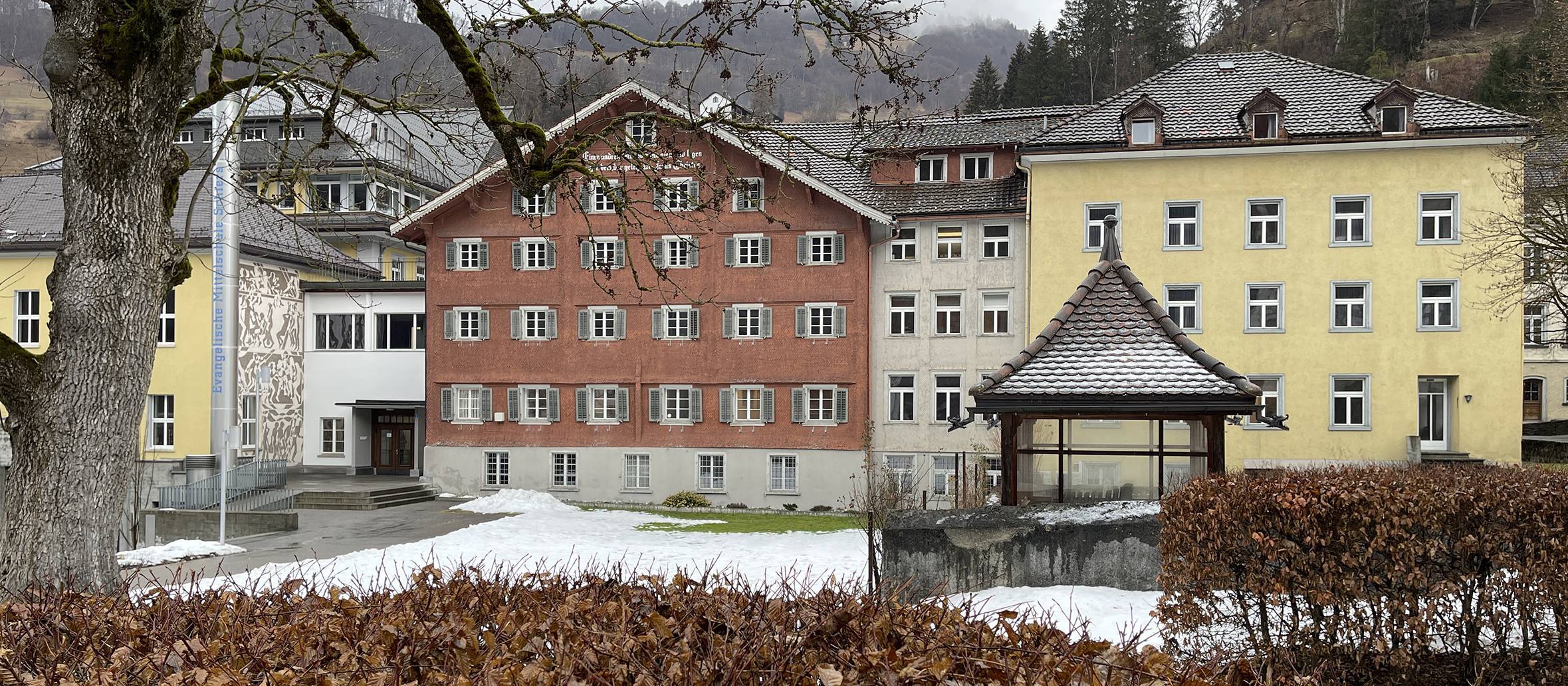 Das Schulareal der EMS in Schiers liegt am Rand des alten Dorfkerns, hinter dem sich freie Landschaft öffnet. Die bestehende Zwischenzeile wird neu gefasst, um den Altbau räumlich und funktional ins Zentrum zu rücken.