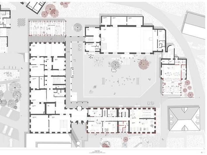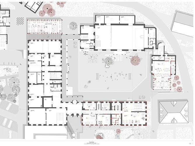 Durch gemeinschaftliche Nutzungen wie Gruppenräume, Lernlandschaften oder Konferenzräume wird der Altbau als kulturelles Herz des Areals gestärkt. Der Neubau respektiert die heterogene architektonische Sprache, übernimmt die Staffelung der Gebäudehöhen und ergänzt die bestehende Vielfalt.
