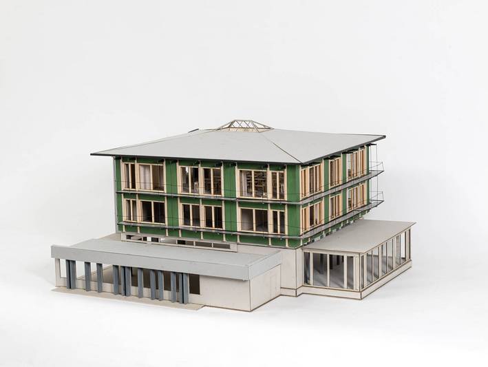 Der bestehende Massivbau wird mit einem neuen Holzbau überstülpt. Richtung Tal entsteht eine neue Gebäugeschicht. Die Wohnungstypologie fördert das gemeinschaftliche Leben. Pro Geschoss steht der grosszügige, mäandernde Gemeinschaftsraum im Zentrum. Dieser nimmt verschiedene Funktionen auf (Teeküchen, TV-Raum, Bibliothek, Kinderspielorte, Garderoben).