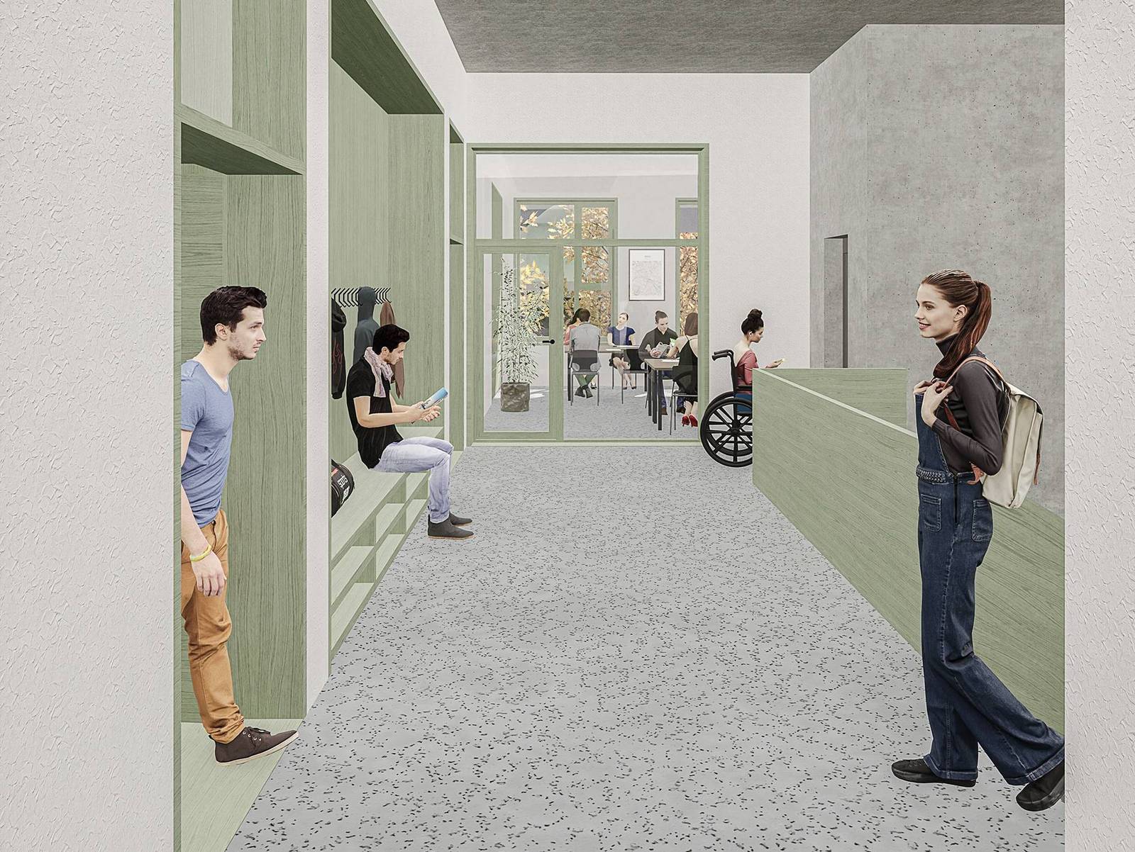 Der Zwischenbau wird barrierefrei und erhält Nebenräume sowie WC-Anlagen. Im Steinbau entstehen offene Arbeitszonen, Klassenzimmer, Gruppenräume und ein Pausenraum mit Schülercafé. Der Westbau erhält einen dreigeschossigen Anbau mit Lernatelier, Klassenzimmern, Gruppen- und Vorbereitungsräumen. Der Ostbau einen eingeschossigen Mehrzweckraum mit mobilen Trennwänden.