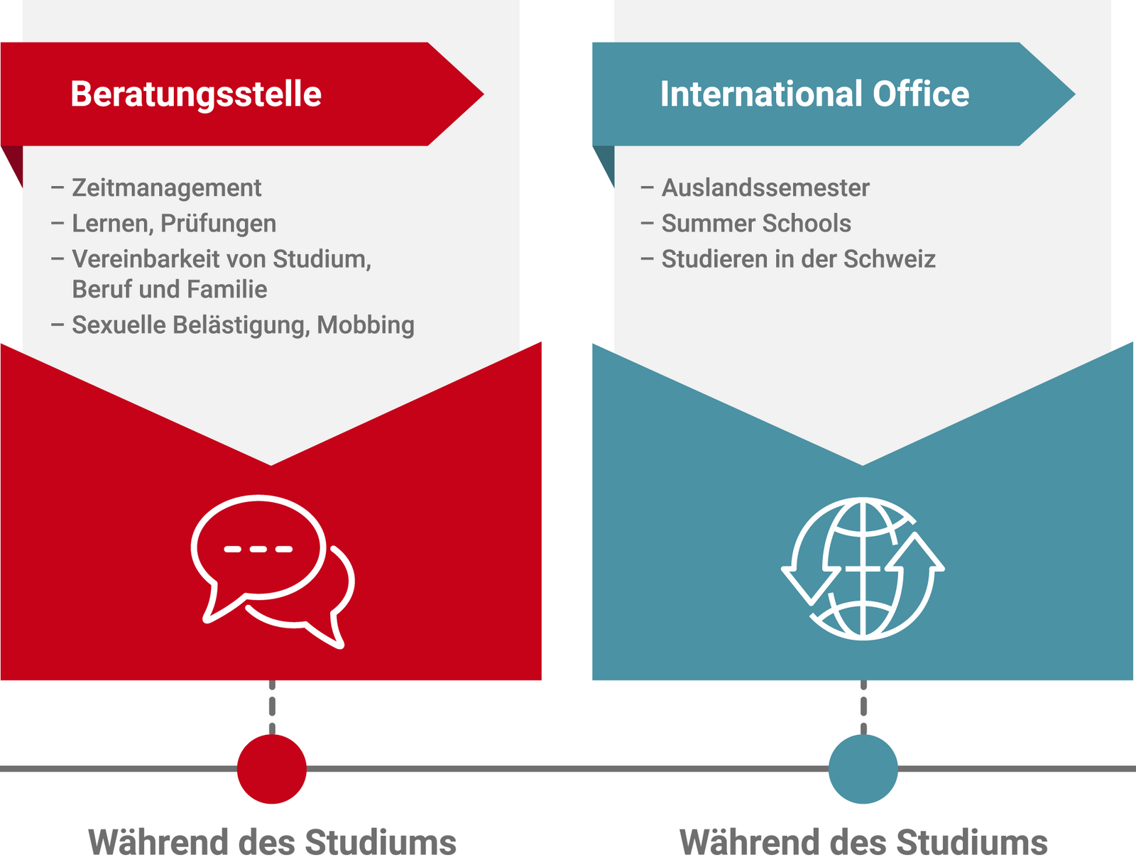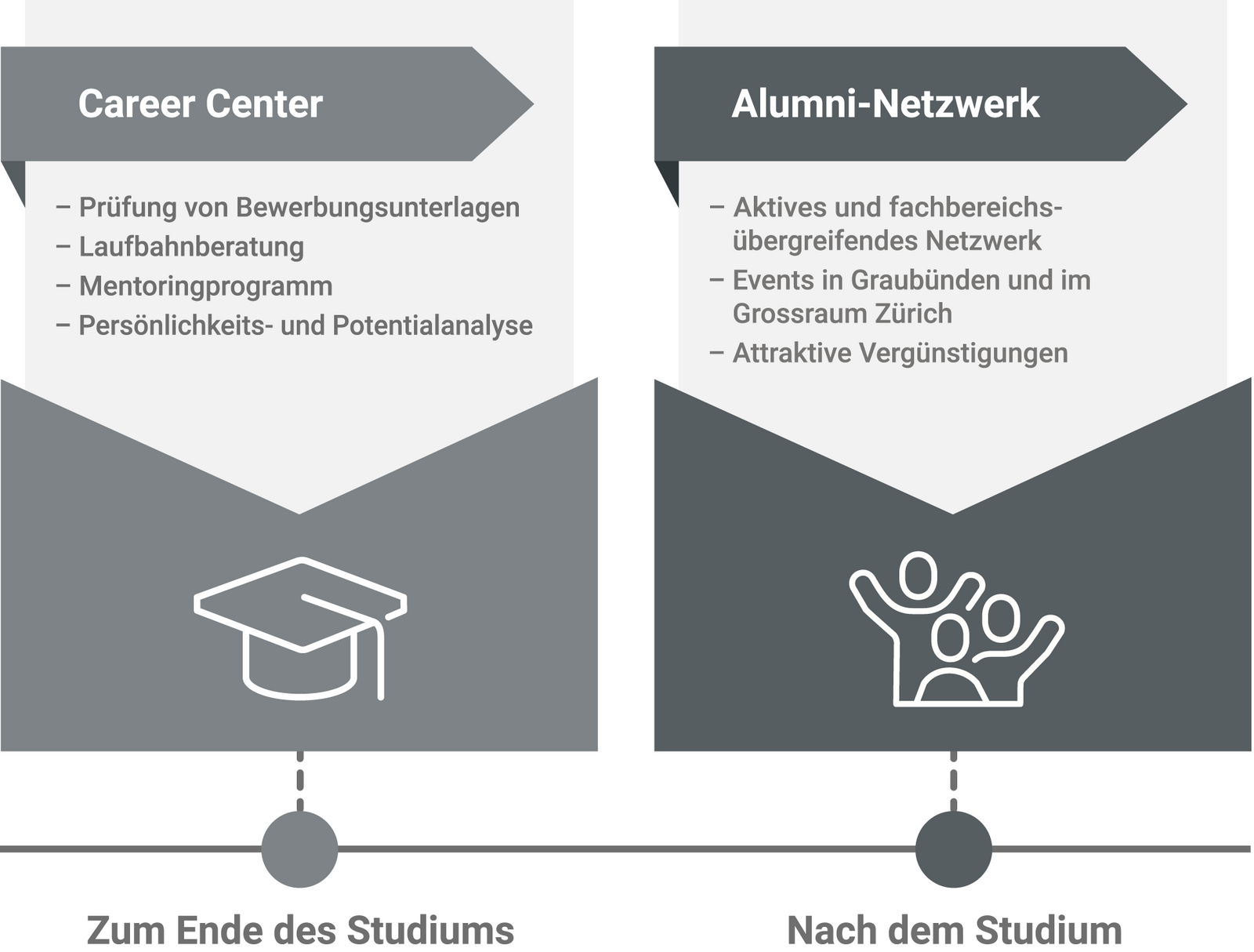 Zahlreiche Dienstleistungen für Studierende in Bachelor- und konsekutiven Masterstudiengängen der FH Graubünden tragen zu Ihrer Förderung und Entwicklung sowie zur Unterstützung Ihres Studienverlaufs bei. Das Beratungsangebot umfasst interne und externe Hilfeleistung bei persönlichen Problemen und Fragestellungen. Das Career Center unterstützt Sie in Fragen der beruflichen Entwicklung. Das Hochschulsportprogramm vermittelt Ihnen ein breites Angebot an Kursen und sportlichen Aktivitäten. Ihre musikalische Ader können Sie im Chor ausleben. Sie können auch von der Stellen- und Wohnungsbörse profitieren, wo Sie fast täglich neue Angebote finden.