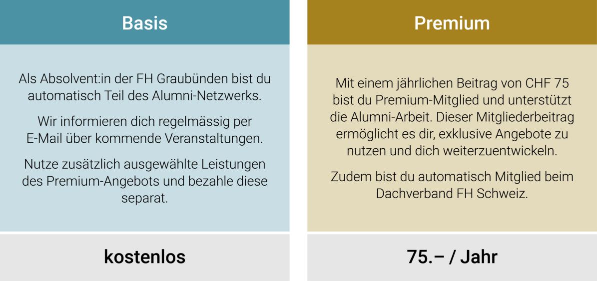 Mit einem jährlichen Beitrag von CHF 75.- wirst du Premium-Mitglied. Dieser Mitgliederbeitrag ermöglicht es dir, exklusive Angebote zu nutzen und dich weiterzuentwickeln. Zudem bist du automatisch Mitglied beim Dachverband FH Schweiz, der sich für dich und die Anliegen der Schweizer Fachhochschulen einsetzt. Wenn du an zwei oder mehr Anlässen teilnimmst, hat sich der jährliche Mitgliederbeitrag von CHF 75.— bereits gelohnt und du bist stets mit der FH Graubünden verbunden!